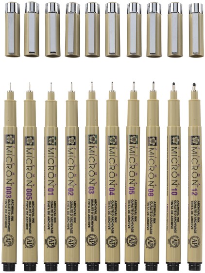 • Pigma Micron-pennen zijn watervaste, permanente fineliners die trouw worden gebruikt door designers, wetenschappers, archivarissen, mangatekenaars, cartoonisten, illustratoren en hobbyisten.