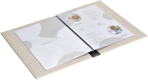 • Menumap uit hoogwaardig linnen incl. 6 transparente tassen (12 pagina’s) in een elegant, warm design.