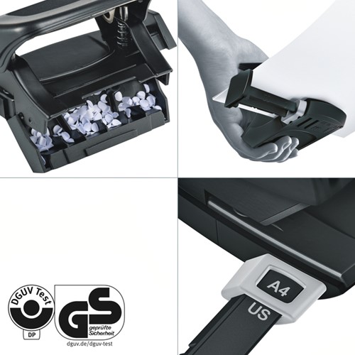 • Gemakkelijk te legen, scharnierend opvangbakje voor papiersnippers.