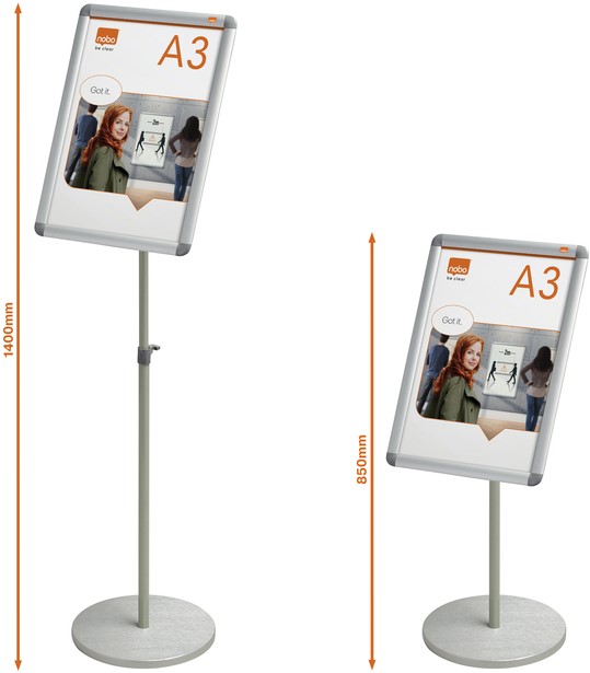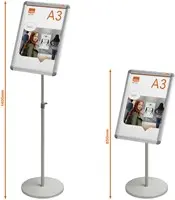 • A3 poster displaystandaard voor het overzichtelijk weergeven van posters, borden en belangrijke informatie. De handige aluminium clicklijst zorgt voor eenvoudige wisseling van de inhoud en heeft een professionele afwerking. Deze vrijstaande displaystandaard is een ideale draagbare oplossing.