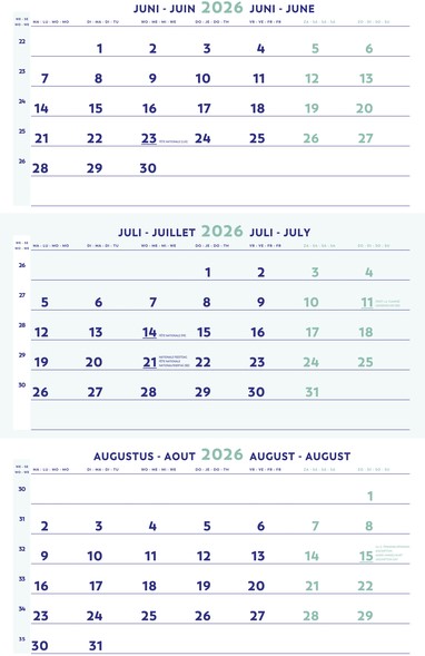 • 12 maanden: januari - december. 3 maanden per pagina. Inclusief datumaanwijzer. Doordachte en functionele lay-out, voor een overzichtelijke planning. Volledige jaarplanning op het rugschild. 4-talig NL-F-GB-D. Met weeknummering. 12 pagina’s - inclusief internationale feestdagen. FSC agendapapier,  vlot beschrijfbaar.