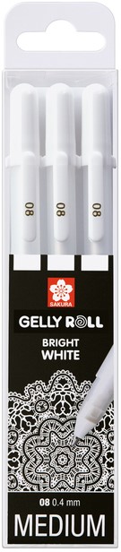 • Set van 3 witte gelpennen met 0,4mm schrijfbreedte. De witte inkt geeft vooral op donker papier een prachtig resultaat.